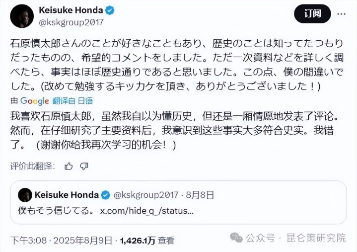 本田圭佑:“原来错的真的是我!”日本前国脚为否认南京大屠杀道歉,2025-08-11,文汇