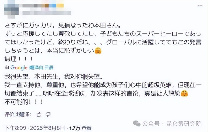 这一转发可捅了马蜂窝,本田圭佑在日本足球圈也算个“顶流”,当年踢世界杯时,好些球迷举着他的海报喊“英雄”,现在他突然跟着右翼分子说这种话,不少球迷与路人都十分不满。